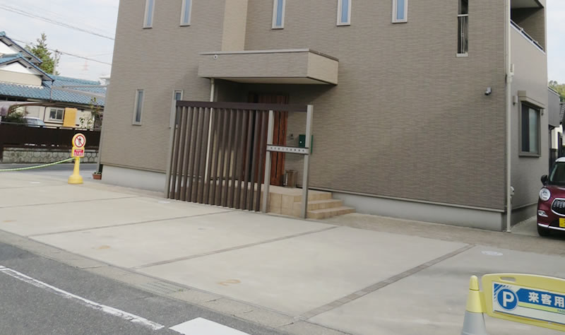 「東屋敷」交差点の正面に見える茶色の3階建ての建物が事務所です。 国道沿い(事務所の正面)に、5台分の来客用駐車場があります。 |